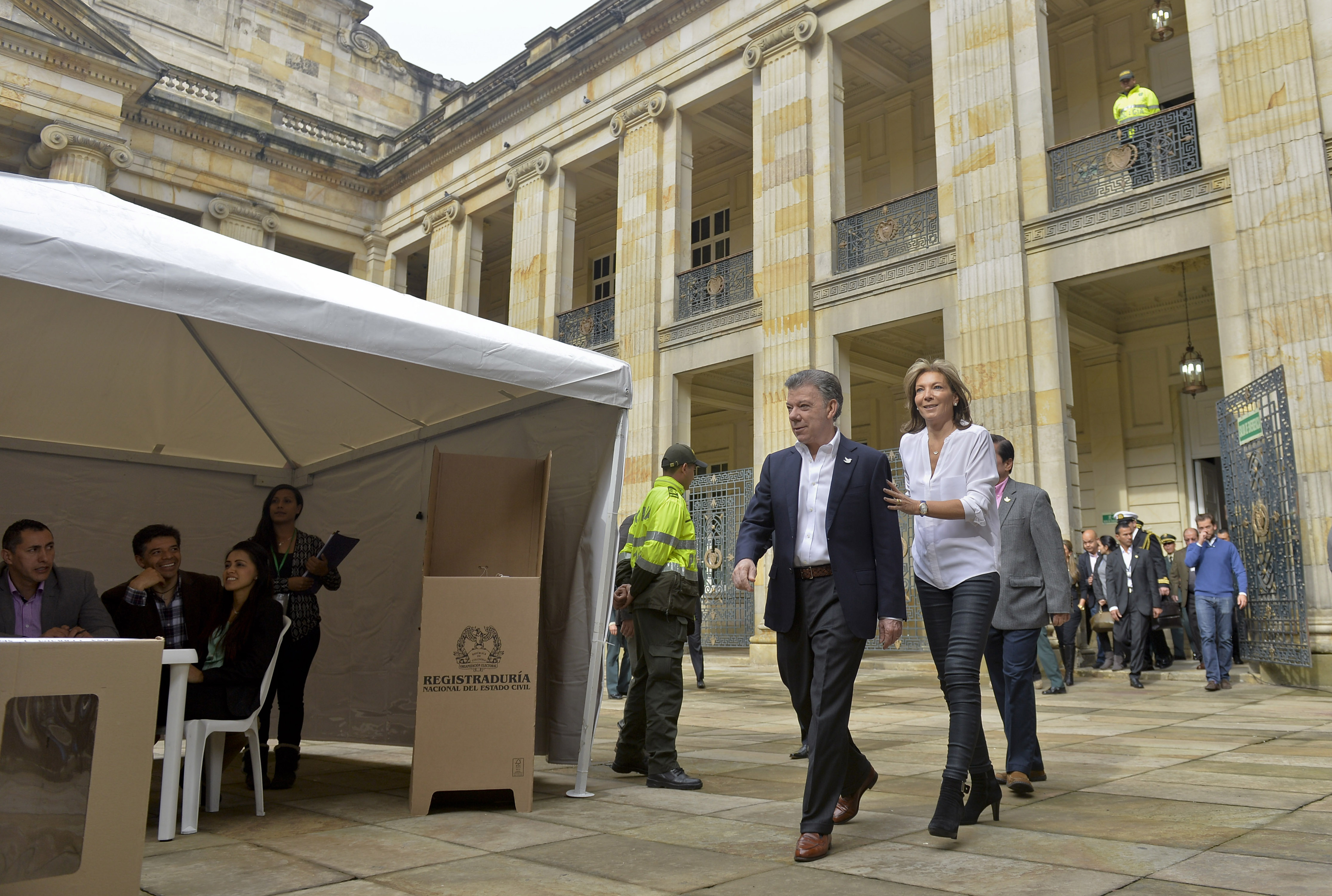 vota santosEl Presidente Juan Manuel Santos y su esposa, la señora María Clemencia Rodríguez de Santos, llegan a la Mesa número 1 de la Plaza de Bolívar para proceder a votar, durante la apertura de las Elecciones Regionales 2015 en el país. El presidente Santos, confió en que las próximas elecciones se realizarán en paz.