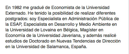 El perfil de Petro en ese portal dice «Economista – Universidad Externado. Tiene especialización en Administración Pública de la ESAP, Master de Economía de la Universidad Javeriana,Especialización en Medio Ambiente y Desarrollo Poblacional en la Universidad Católica de Lovaina.Doctorado en Nuevas Tendencias en Administración de Empresas en la Universidad de Salamanca».
