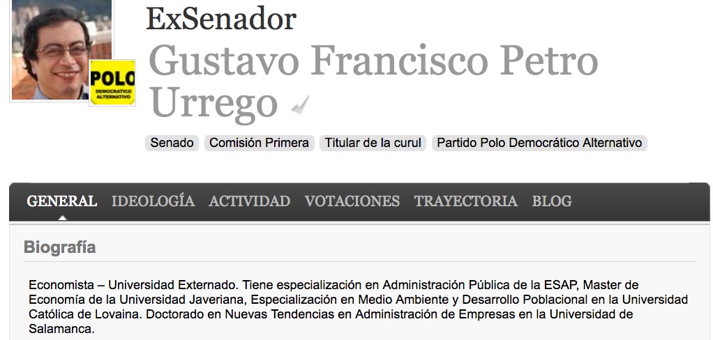 2. Pero en el portal del programa Congreso Visible, de la Universidad de los Andes, que hace seguimiento a todo el trabajo de Senado y Cámara, aparece un perfil de Petro en el que se dice, sin duda ninguna, que es «Doctor» de la Universidad de Salamanca. Los datos de los congresistas, según me confirmó la oficina de comunicaciones de Congreso Visible, corresponden a lo que el mismo congresista les reporta a ellos, bien a través de sus mismas oficinas con su autorización o bien directamente el propio Senador o Representante a la Cámara.