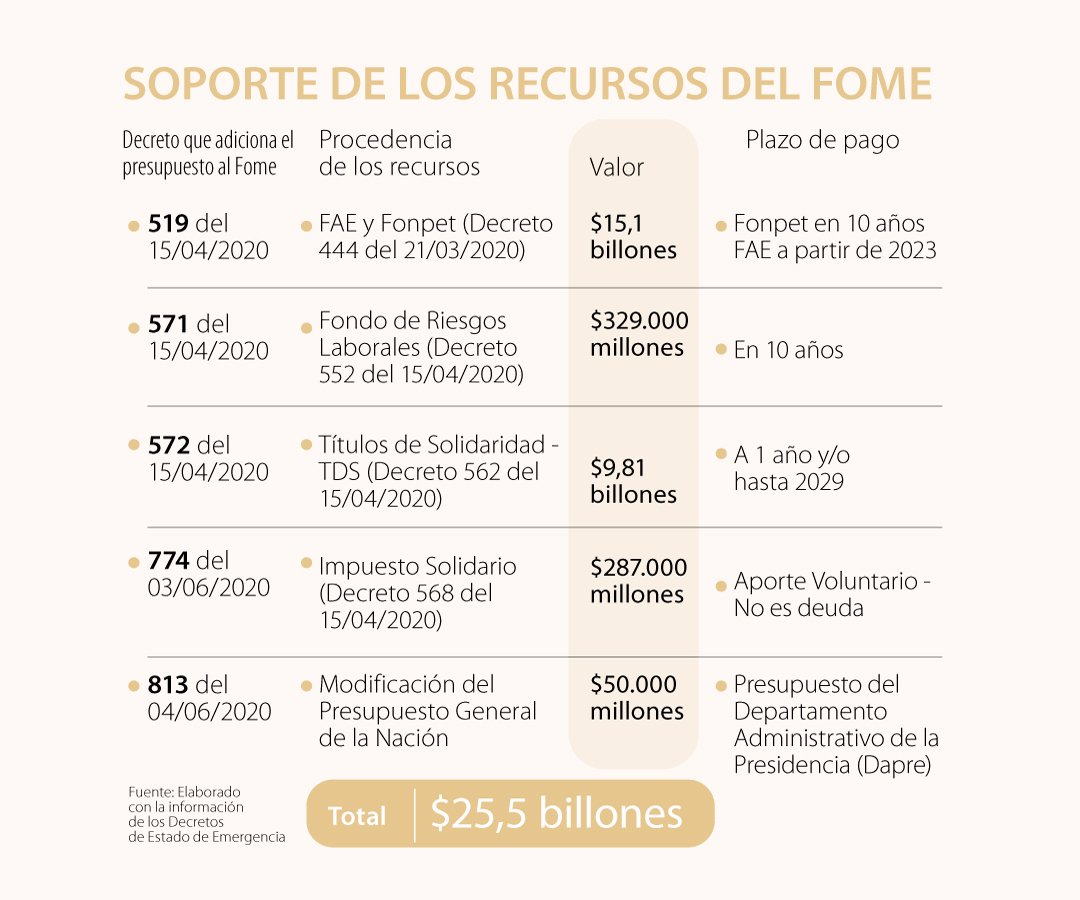 ¿Para qué se creó el Fome? A la fecha, este se ha consolidado con $25,57 billones: $287.000 millones de aporte solidario voluntario, $50.000 millones de traslado presupuestal y $25,24 billones de deuda que deberán pagar los próximos tres gobiernos y que supera el recaudo de más de tres reformas tributarias. ¿De dónde sale la deuda? $15,42 billones se sacaron de otros fondos públicos (FAE, Fonpet y el Fondo de Riesgos Laborales) con la promesa de pagarse en diez vigencias, a excepción del FAE, al que se le pagará a partir de 2023. Por otro lado, $9,81 billones son de Títulos de Solidaridad adquiridos por entidades financieras que cobrarán una tasa fija de interés y deberá pagarles en un año o hasta 2029.