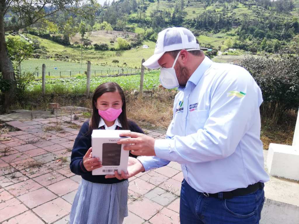 Todos los niños del municipio, fueron beneficiados con la entrega de más de 1.200 tablets, para poder acceder fácilmente a la cobertura de Internet y a sus clases escolares. El alcalde Camilo Pardo, hace entrega a los niños de su municipio.