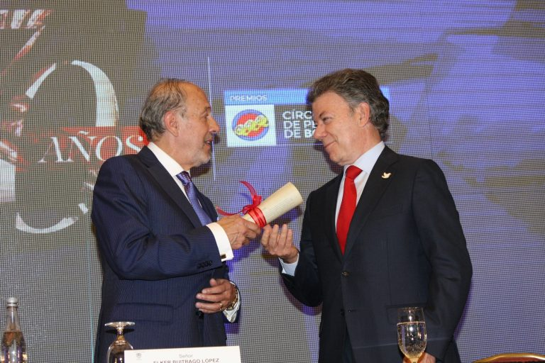 Élker Buitrago entrega un pergamino al Ex-Presidente Juan Manuel Santos, en honor a su padre Enrique Santos, uno de los fundadores del Círculo de Periodistas de Bogotá.