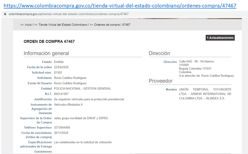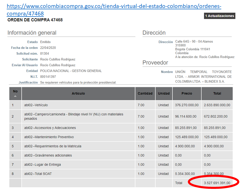 Las compras aparecen en el portal colombiacompra.gov.co. La primera por $3.527.691.391 millones de pesos; la segunda por $3.221.878.140 millones de pesos; y la tercera por $2.892.049.806 millones de pesos. Cada camioneta blindada costó en promedio $391 millones de pesos.