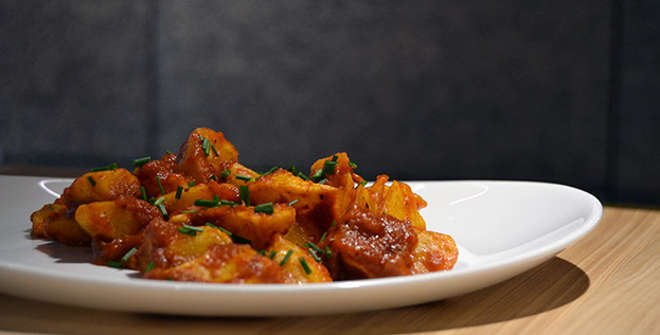 Cortamos las patatas en trozos grandes y las preparamos en sartén, pero en dos pasos. Primero, las pochamos a baja temperatura, y, luego, las freímos a 180 o 200 grados para que queden crujientes. Cuando ya estén listas, calentamos un poco de salsa, se las echamos por encima, les damos dos vueltas y las sacamos. Las patatas tienen que estar bien embadurnadas de salsa brava, que, gracias al rocoto, será bravísima.