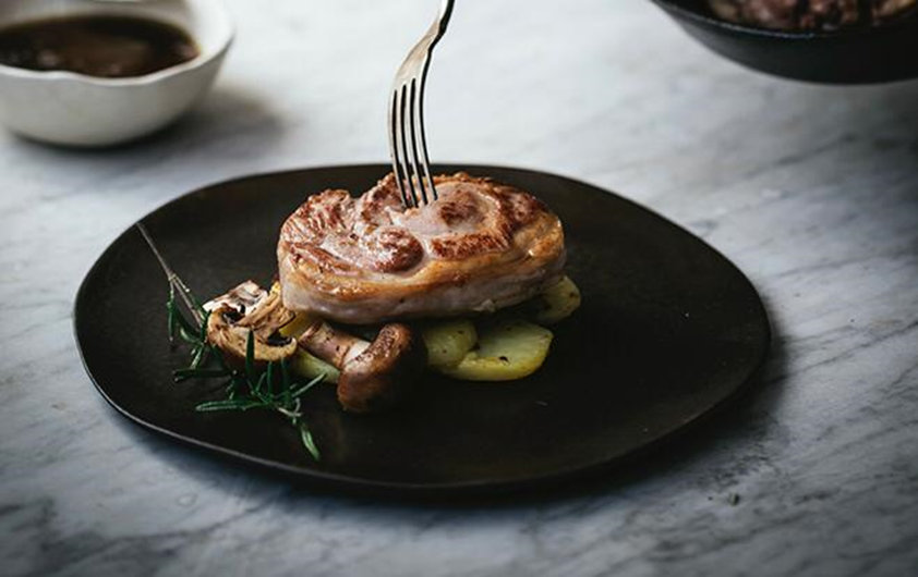 Servimos cada Tournedó sobre una cama de patatas laminadas, acompañado de los champiñones salteados y a reducción de mostaza y miel.