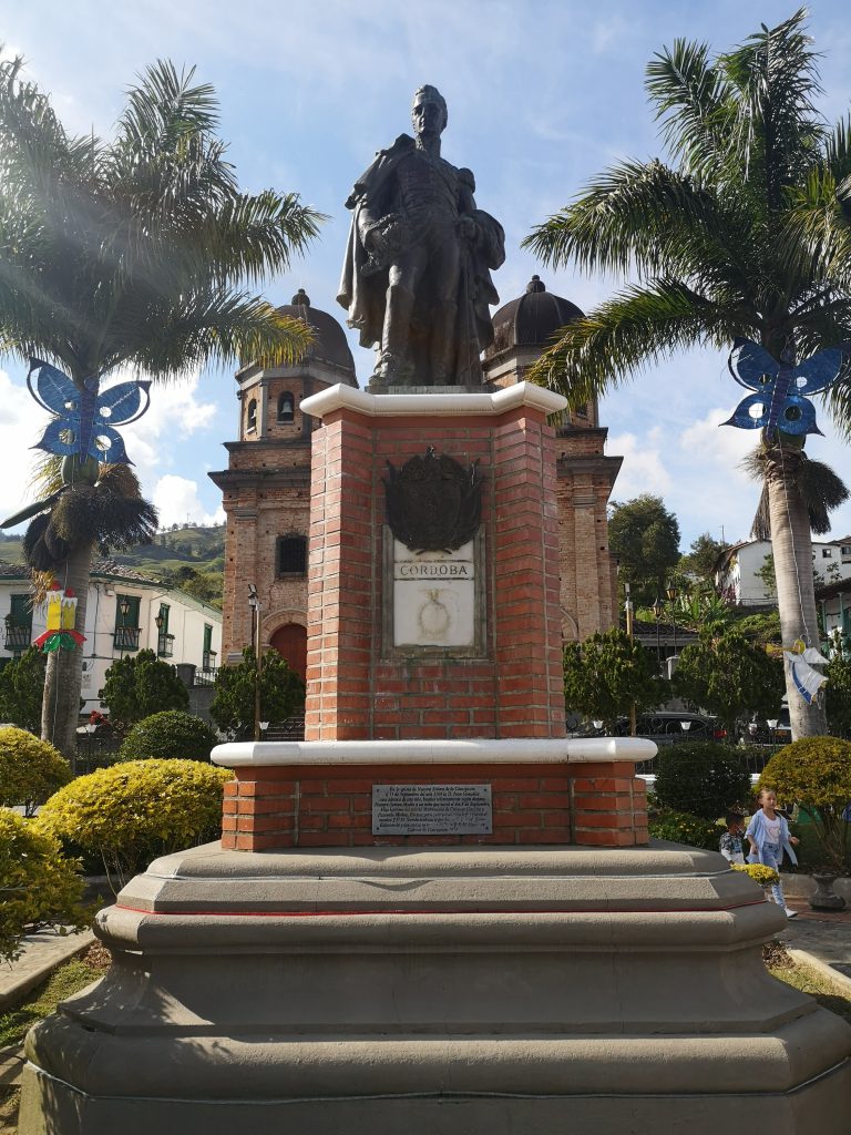 Monumento a José María Córdova en su pueblo natal, donde se lee Córdoba.