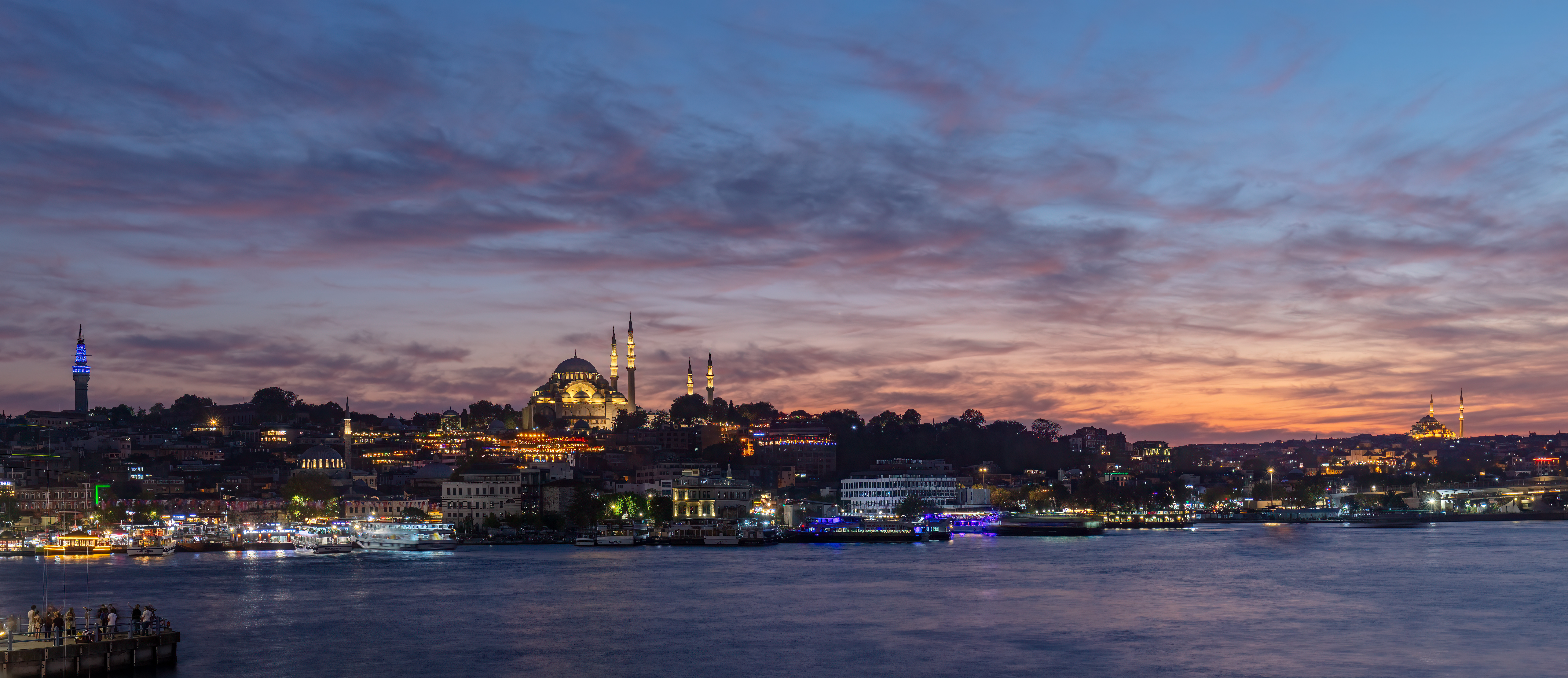 A la luz del crepúsculo, el Cuerno de Oro en Estambul revela una silueta hipnótica de cúpulas y minaretes otomanos que se iluminan sobre la orilla del mar. La escena captura la mística intersección de Europa y Asia, donde la historia imperial se encuentra con el vibrante atardecer.