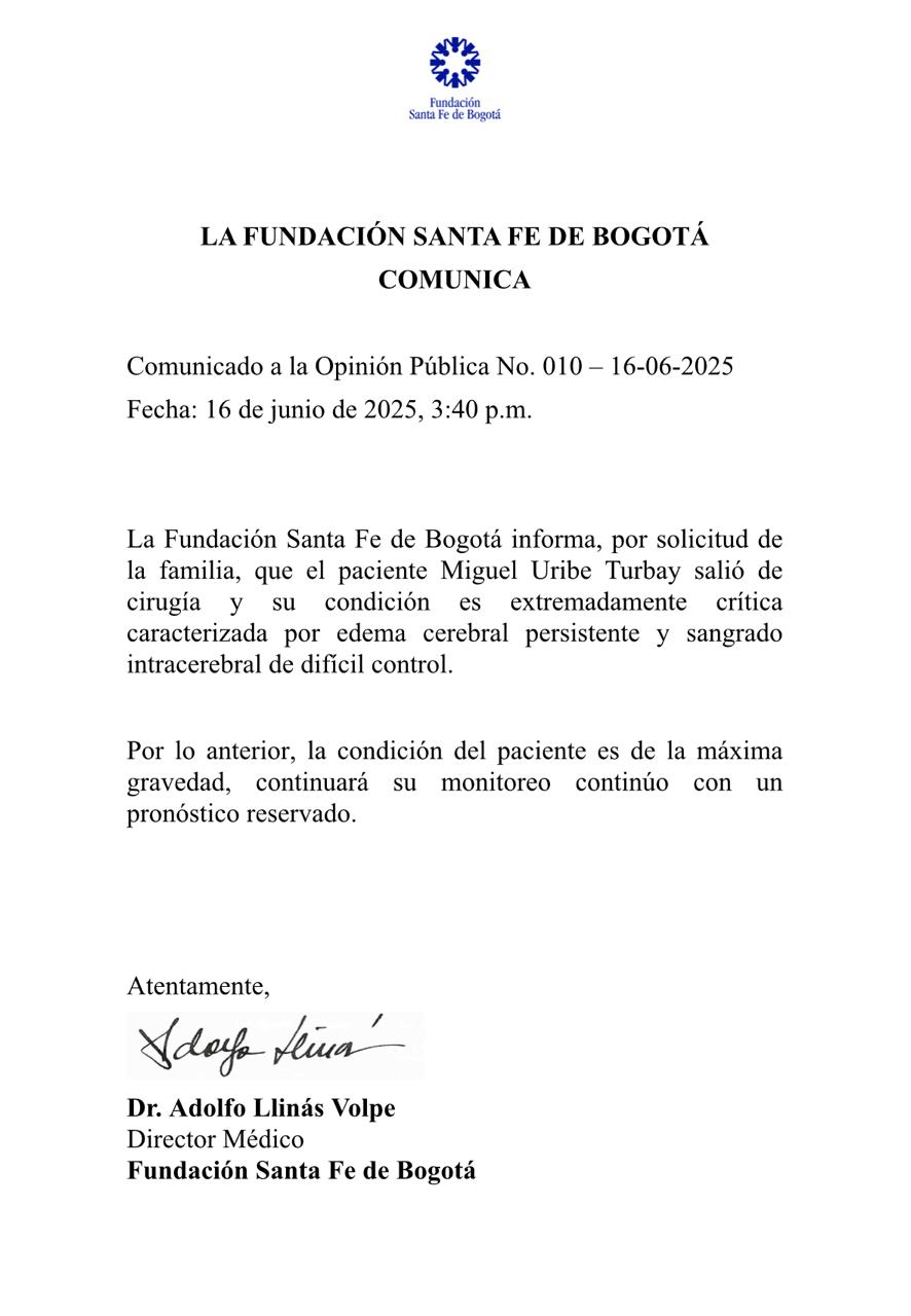 Colombia permanece en vilo ante el delicado estado de salud del senador Miguel Uribe Turbay, quien continúa su lucha por la vida tras el atentado que sufrió. Su condición ha sido reportada como de «máxima gravedad», una situación crítica derivada de un edema cerebral persistente y un sangrado intracraneal de difícil control, consecuencias directas de los impactos de bala recibidos.