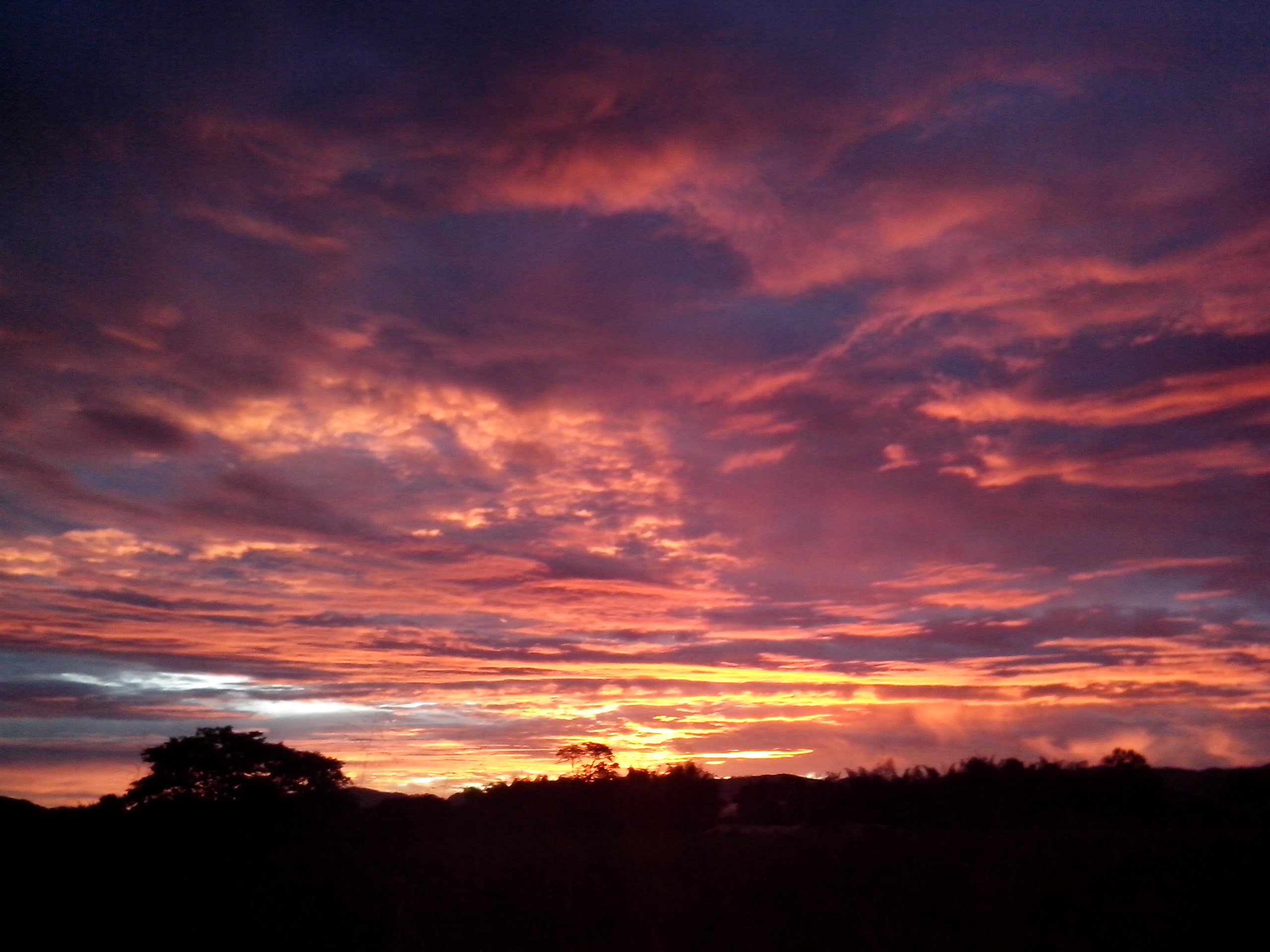 El amanecer en Pitalito, Huila, se pinta con una espectacular paleta de colores, donde intensos tonos anaranjados, rojos y púrpuras se mezclan en las nubes. El cielo parece incendiarse sobre la silueta oscura de la vegetación, ofreciendo un contraste vibrante que anuncia el día.