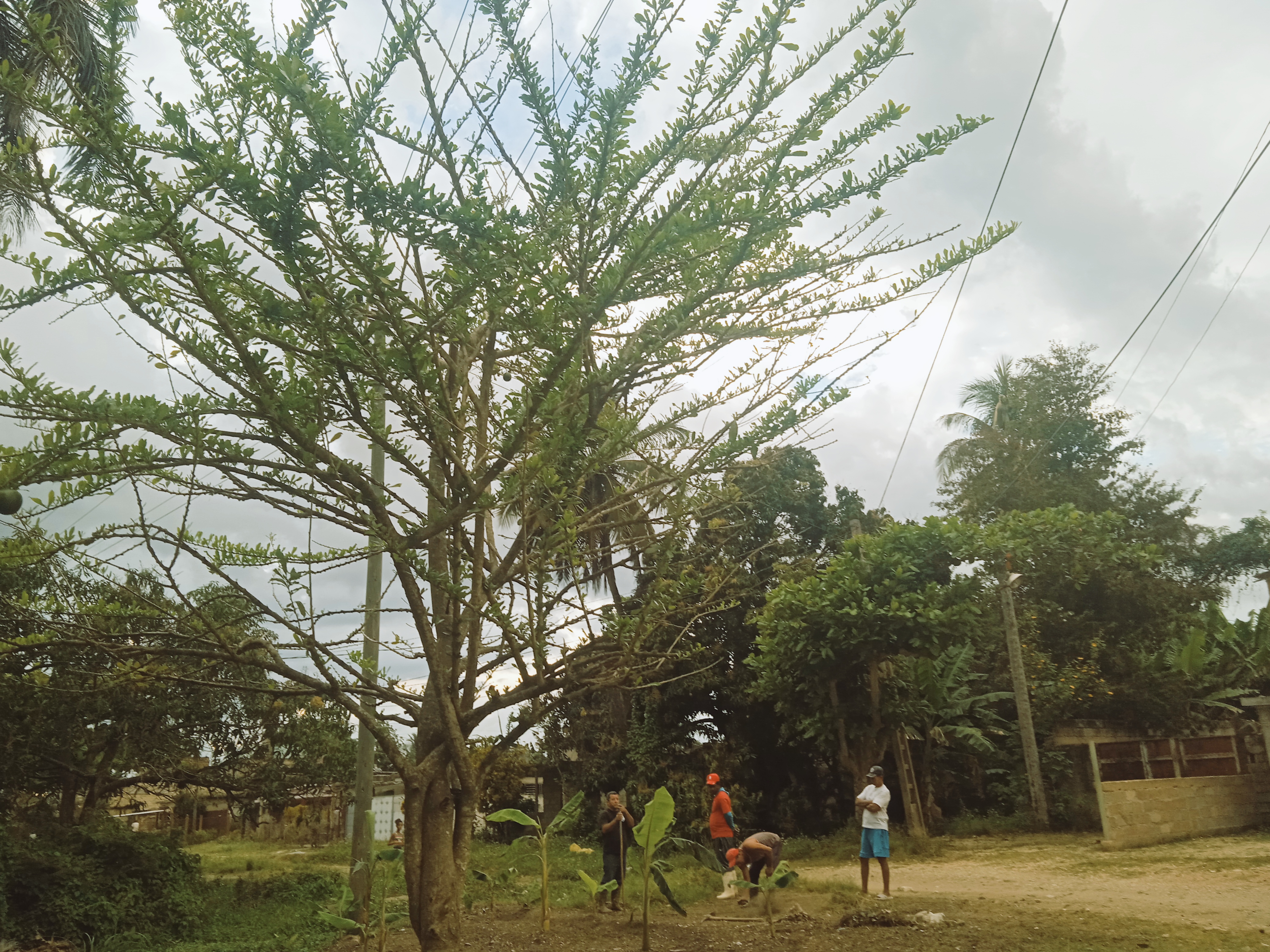 El visoño platanal ahora se une a un árbol de güira y otro de mango, este último florece y asoman las primeras frutas de la temporada, para beneficiar principalmente a niños y adolescentes de la comunidad.