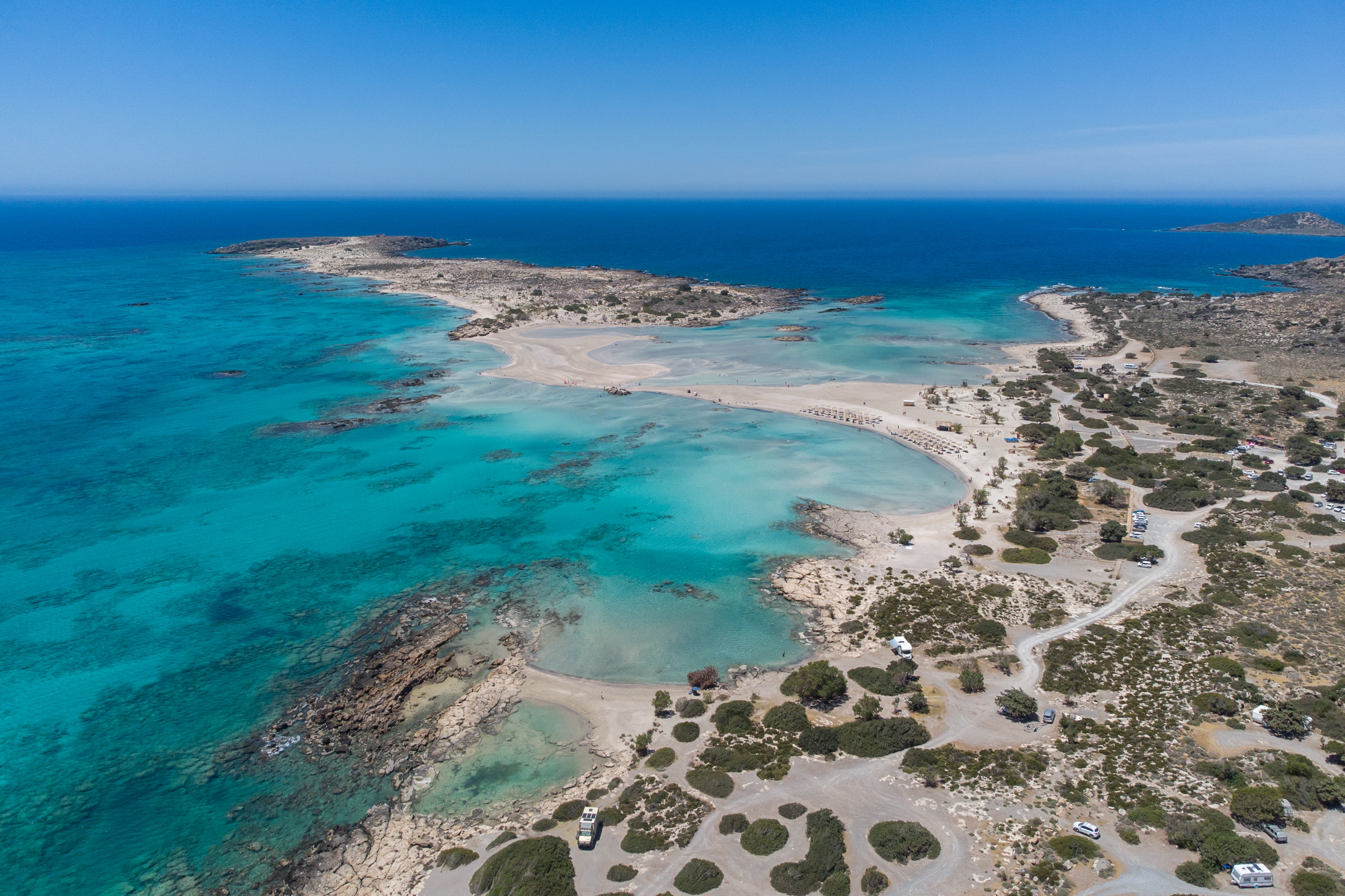 Una vista aérea de Elafonisi revela sus icónicas aguas turquesas poco profundas y sus extensiones de arena, que en algunas zonas adquiere un distintivo tono rosado. Numerosas lagunas y pequeñas islas de arena se entrelazan con la tierra, creando un paisaje costero único y pintoresco en Creta.
