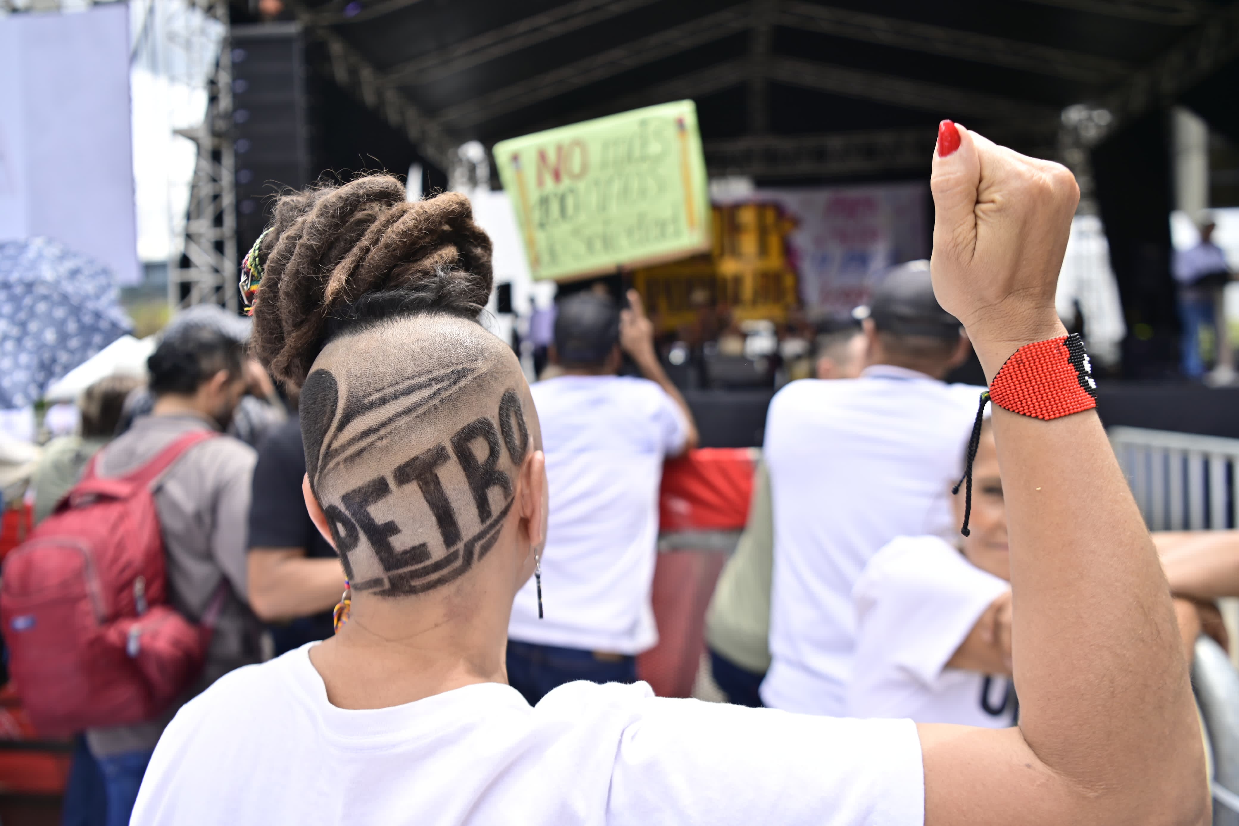 Una manifestante captó la atención al mostrar un singular acto de apoyo: una mujer decidió raparse parte de su cabellera para dejar visiblemente marcado el nombre del presidente Petro.