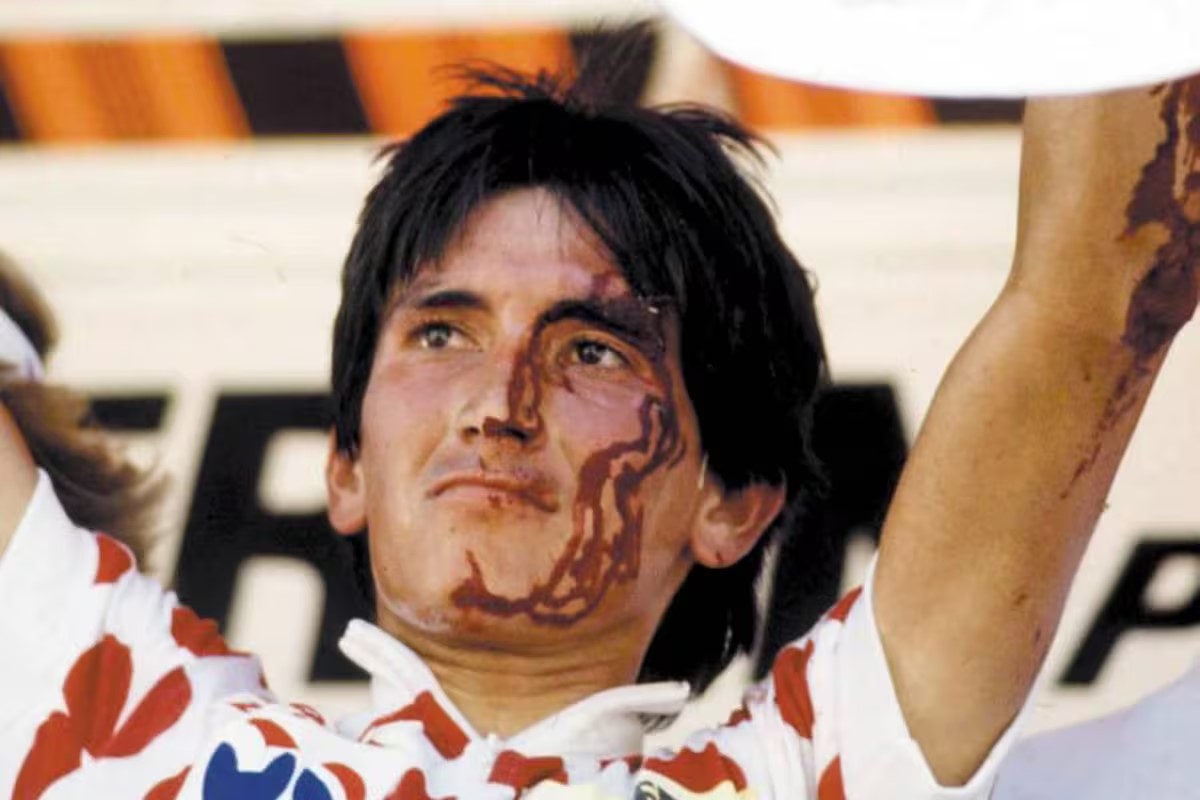Luis Alberto «Lucho» Herrera, con su cara ensangrentada, después de una caída en la 14ª etapa del Tour, donde logró el triunfo.