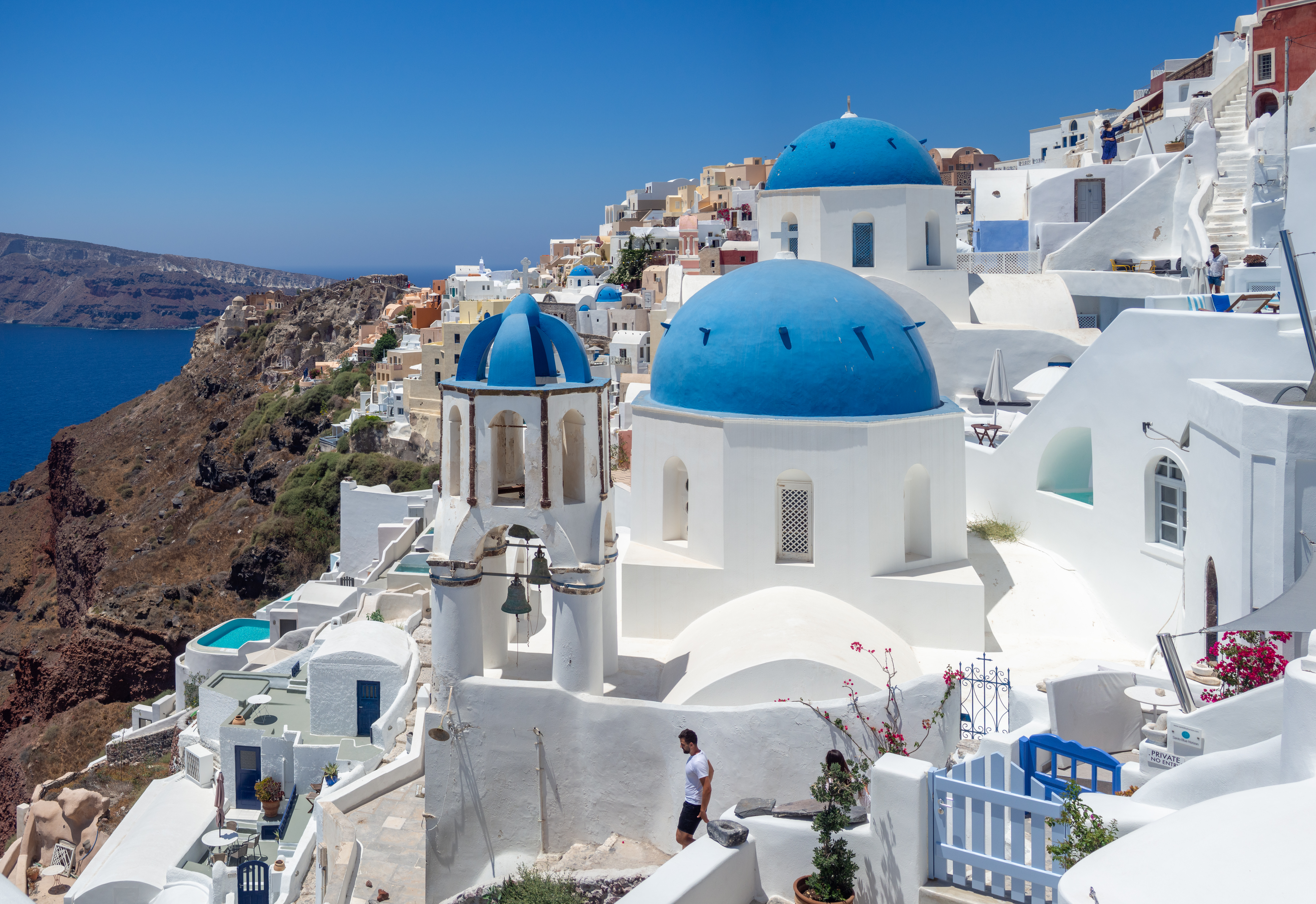En el corazón del idílico archipiélago de Santorini, emergiendo majestuosa de la imponente caldera volcánica, se alza Oia, un pintoresco pueblo que encarna la esencia de la belleza cicládica. Sus icónicas casas encaladas, que se aferran con audacia a los escarpados acantilados, y sus cúpulas de un azul vibrante, conforman un paisaje de postal que se funde armoniosamente con el azul profundo del mar Egeo. Cada rincón de Oia ofrece una perspectiva inigualable, un balcón natural suspendido entre el cielo y el vasto horizonte marino.