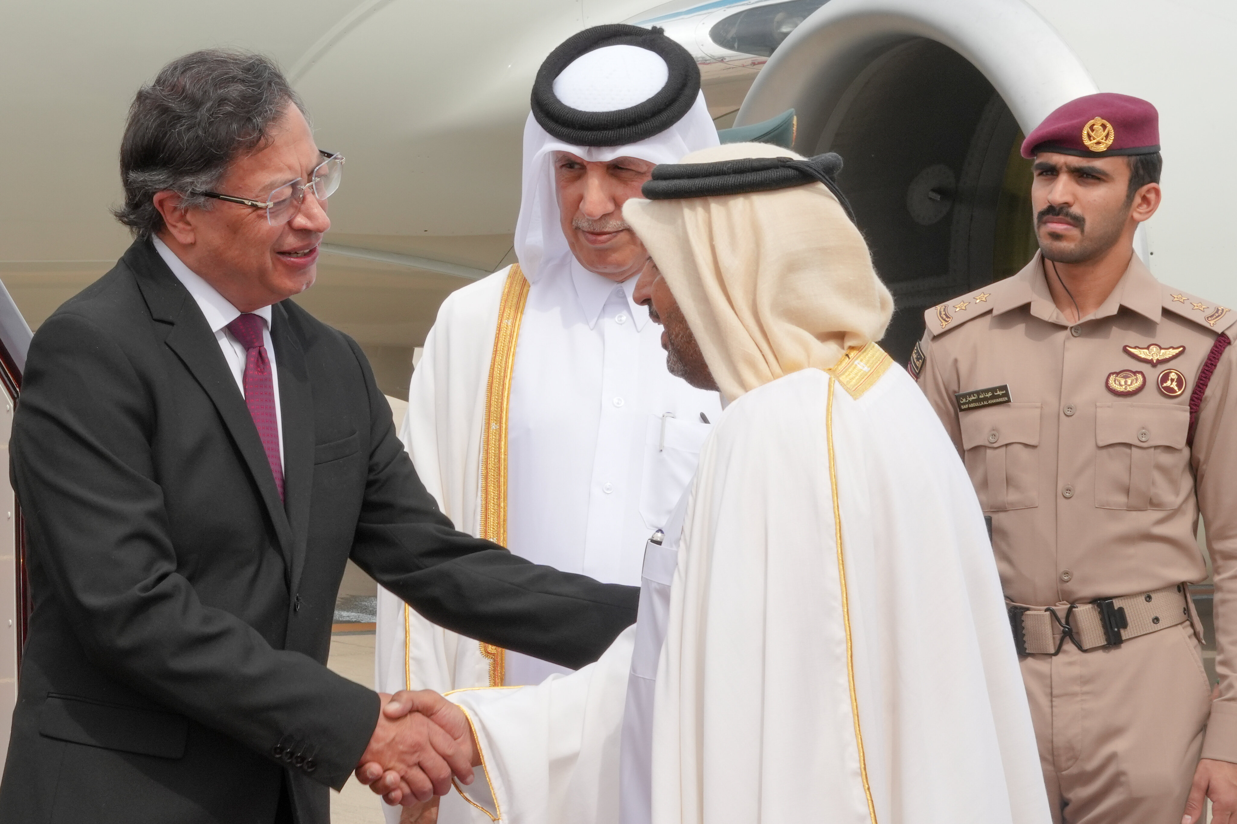 A su arribo a Qatar, el presidente Petro fue recibido con honores en el Aeropuerto de Doha por el sultán Bin Saad Bin Sultan Al Muraikhi, Ministro de Estado de Relaciones Exteriores de Qatar, en un gesto que refleja el alto nivel de las relaciones bilaterales.
