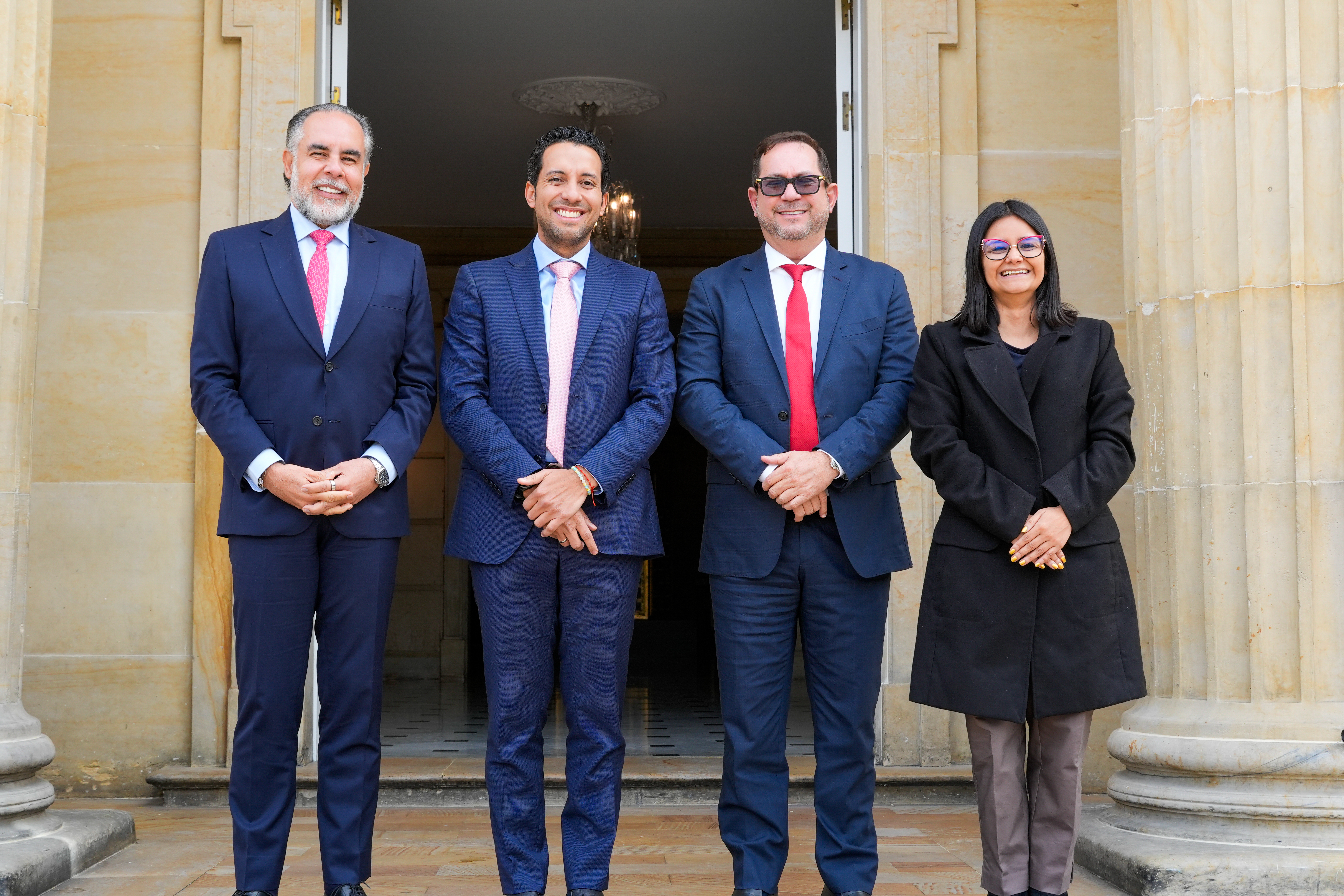 El ministro del Interior, Armando Benedetti, recibiendo a los presidentes del Congreso, Julián López (Cámara de Representantes) y Lido García (Senado), en compañía de Angie Lizeth Rodríguez Fajardo, Secretaria General de la Presidencia de la República.
