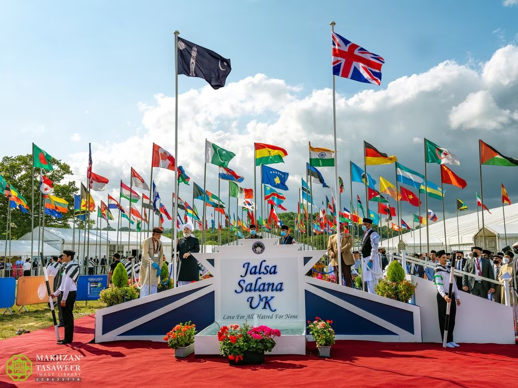 Durante la Jalsa Salana, Su Santidad Hazrat Mirza Masrur Ahmad, el Quinto Califa, presidió una plaza adornada con más de 100 banderas, simbolizando la diversidad de los países presentes en la convención anual de la Comunidad Musulmana Ahmadía.