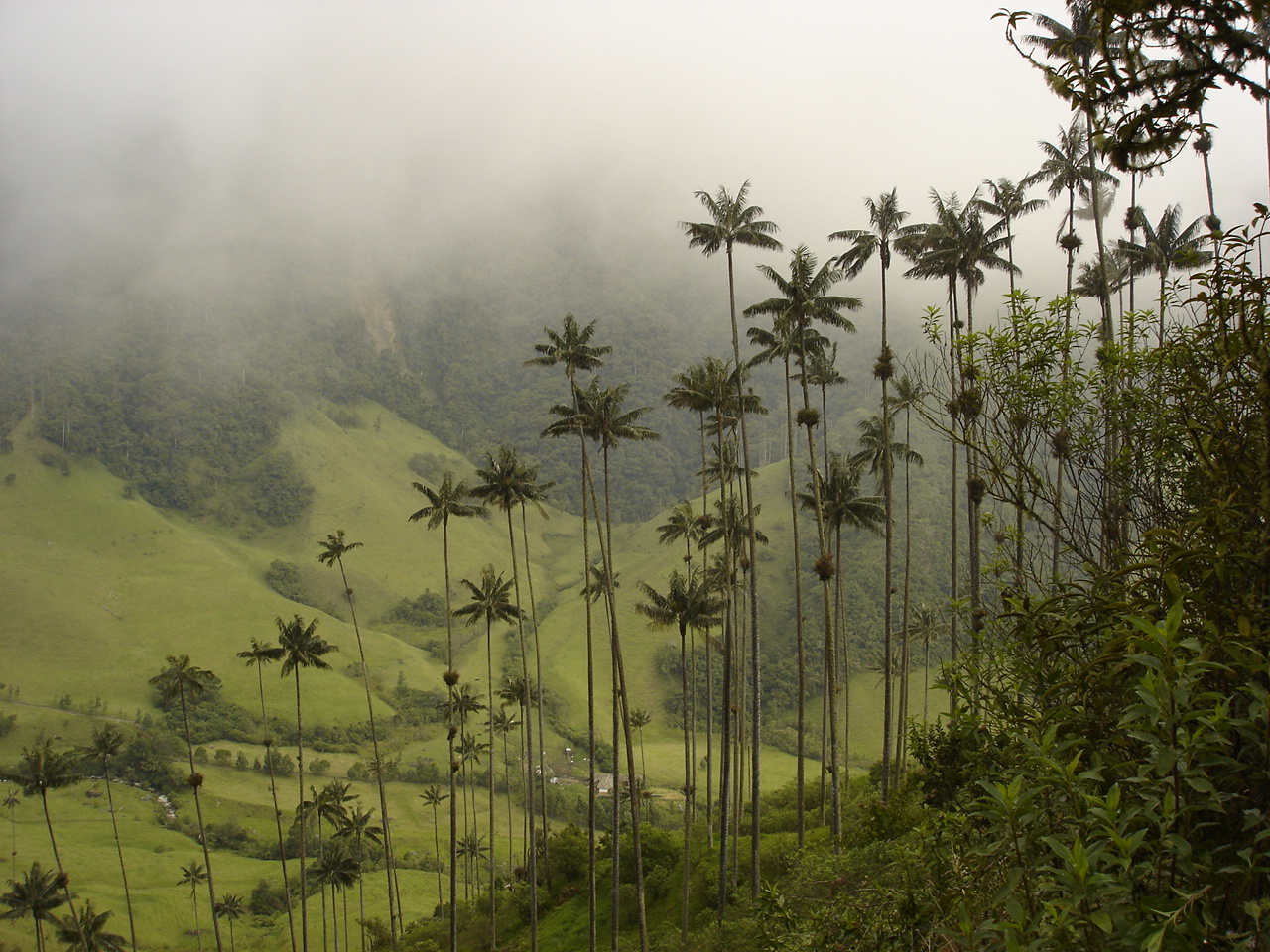 Valle del Cocora: Un paisaje onírico, donde la densa niebla abraza las gigantescas palmas de cera que se alzan hasta los 60 metros de altura, creando una vista digna de postal.
