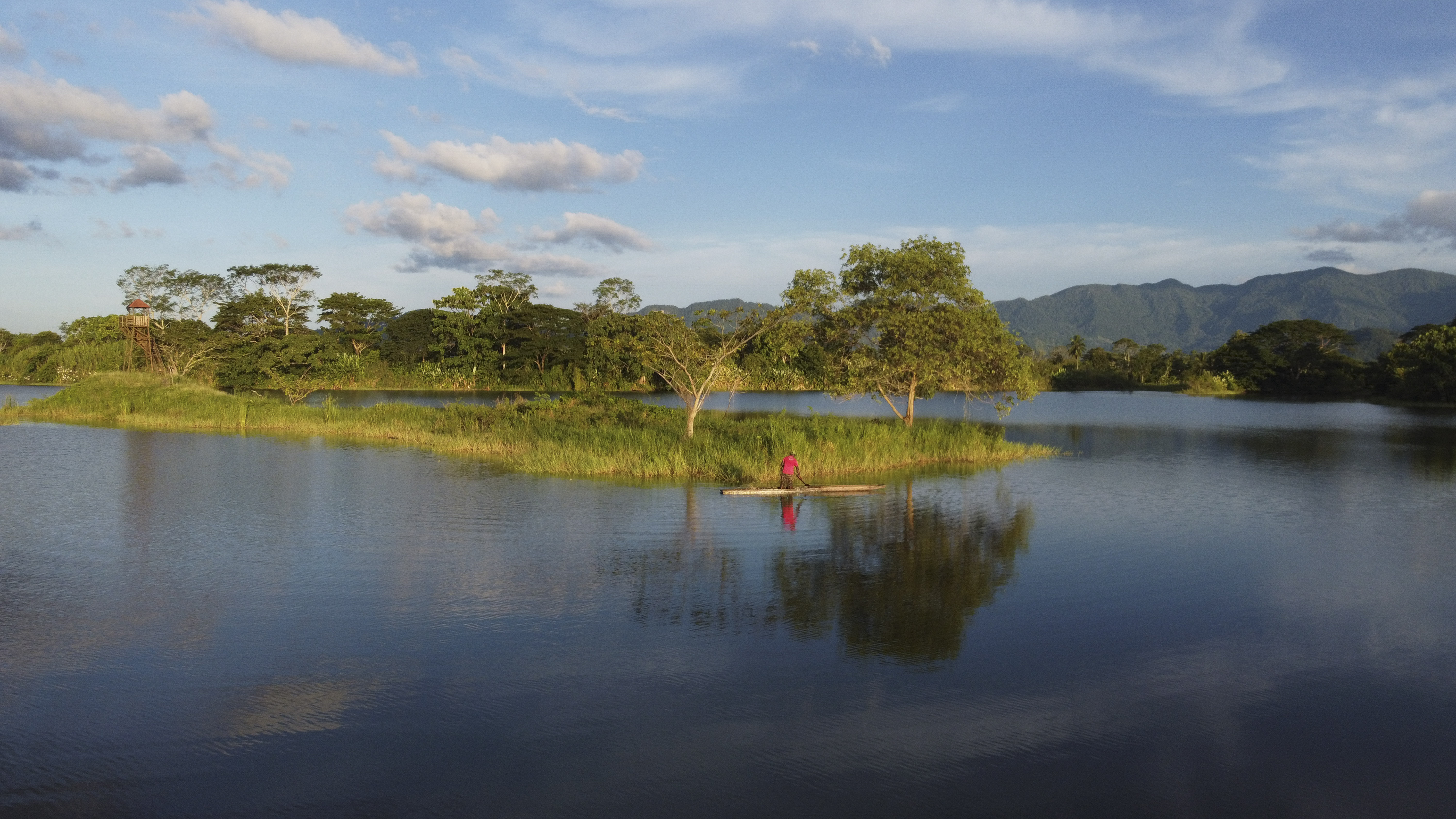 Tierralta, Córdoba, se revela en la imagen como un paisaje sereno donde la naturaleza reina. Un vasto cuerpo de agua, bordeado por exuberante vegetación e islas con árboles, se extiende bajo un cielo azul salpicado de nubes, evocando tranquilidad y belleza natural.