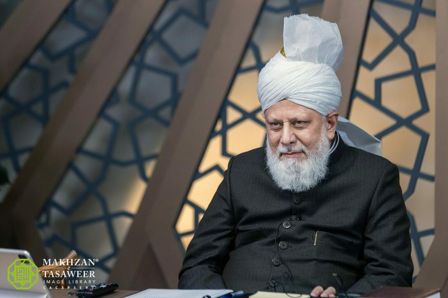 Su Santidad, Mirza Masrur Ahmad, Quinto Sucesor del Mesías Prometido y  líder espiritual actual de la Comunidad Musulmana Ahmadía]