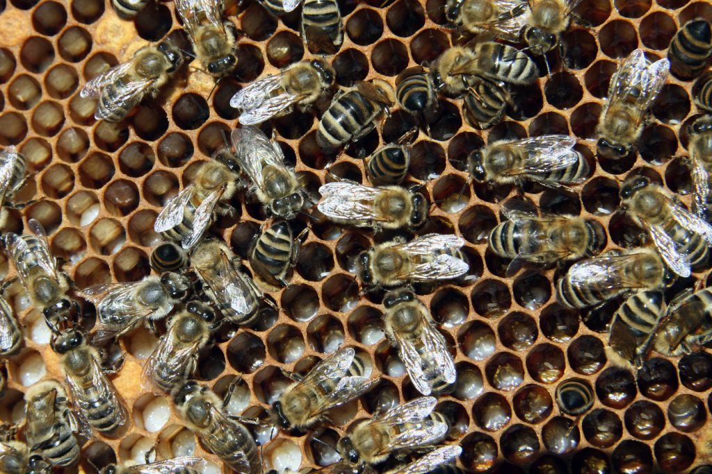 Panal de abejas domésticas con huevos y larvas en las celdillas
