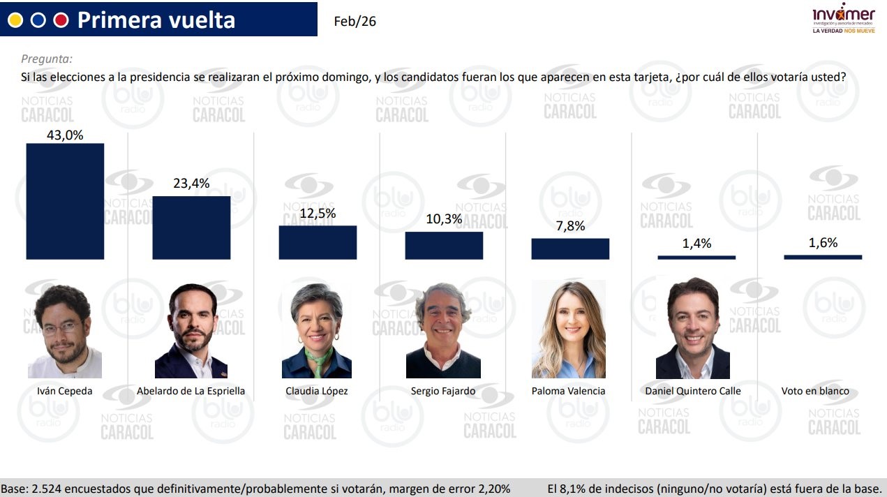 La política colombiana ha recibido un sacudón con la publicación de los datos de la encuesta Invamer para Noticias Caracol y Blu Radio. Las cifras no solo confirman liderazgos, sino que dibujan un mapa electoral donde los extremos han desplazado casi por completo al centro tradicional.
