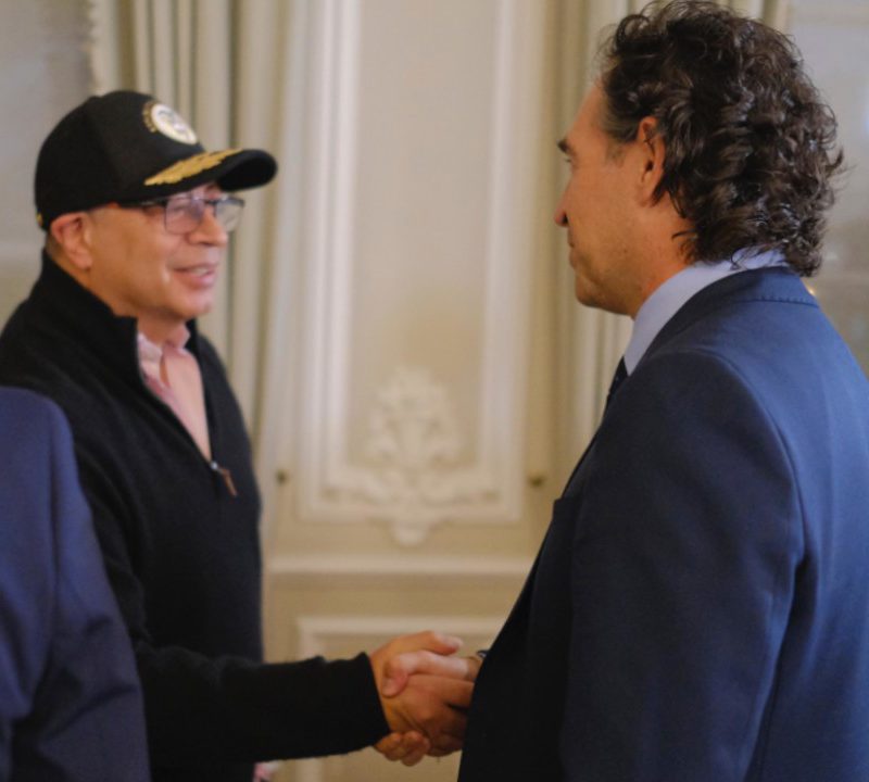 El presidente de la República, Gustavo Petro, y el alcalde de Medellín, Federico Gutiérrez, se saludan con un formal apretón de manos.