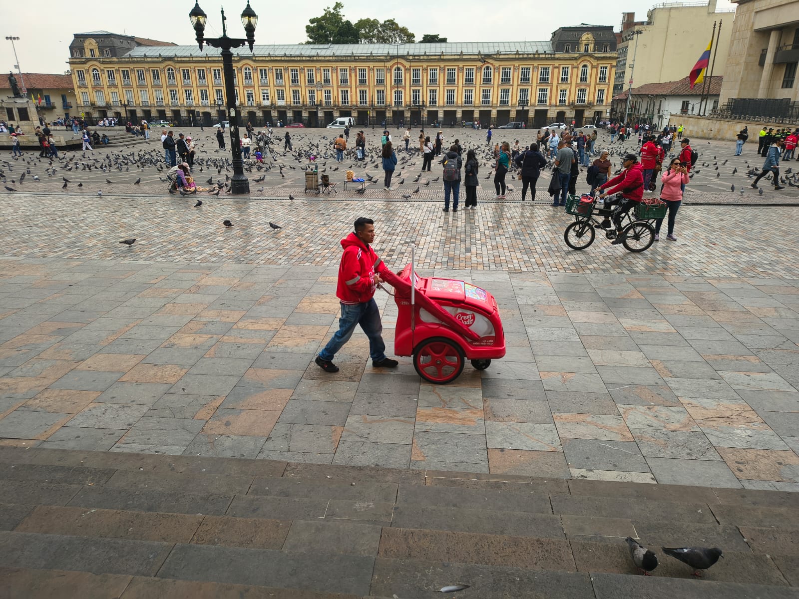 Bajo el frío persistente de la Plaza de Bolívar, el paletero desafía el clima con optimismo, ofreciendo su dulzor entre la multitud que transita el centro del poder. Su figura se vuelve un símbolo de calidez y resiliencia en medio del gris arquitectónico y la solemnidad política de Colombia.