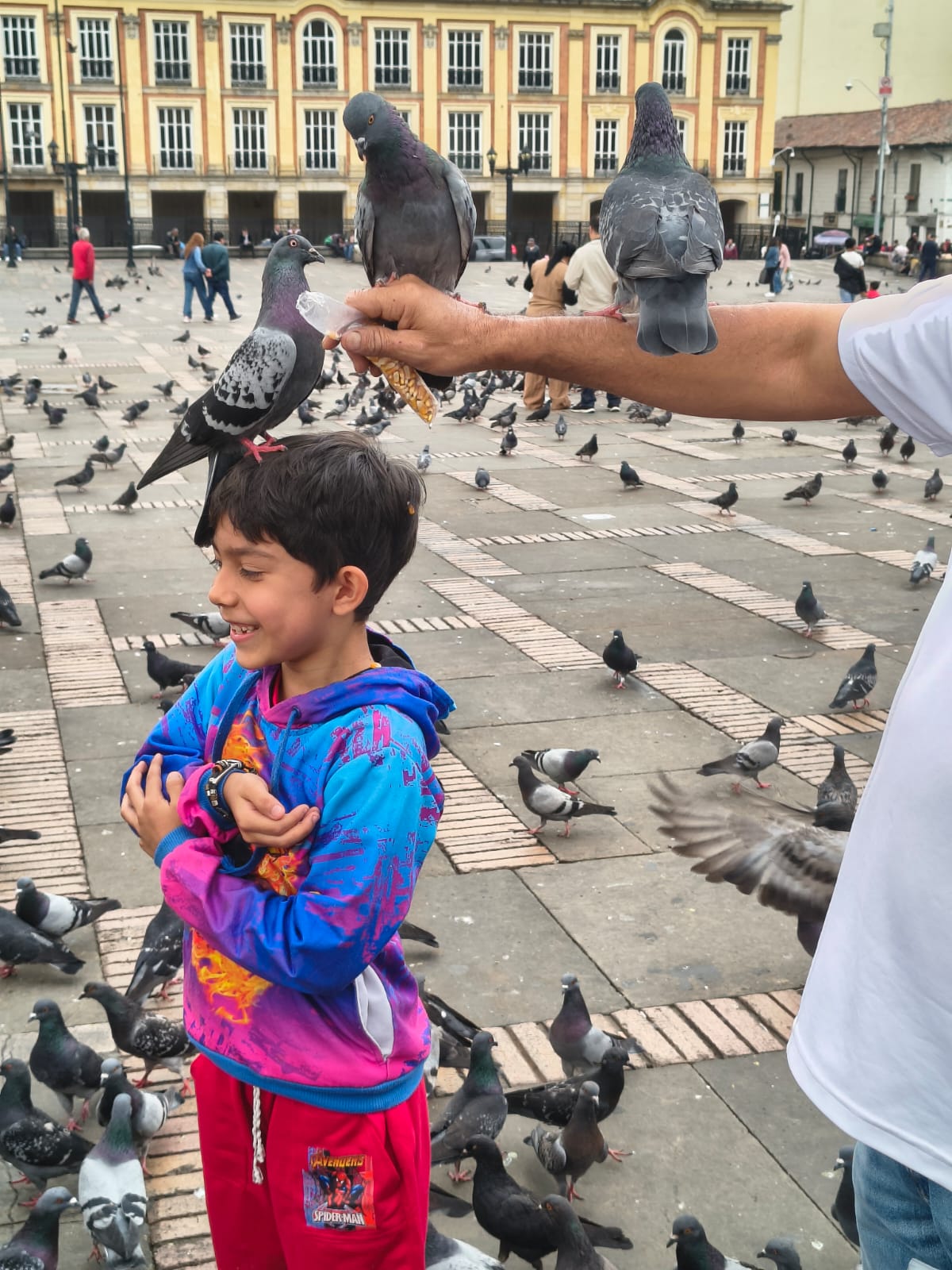 En el corazón de la Plaza de Bolívar, las palomas invitan a un encuentro cercano y lúdico, posándose con confianza incluso sobre los niños. Estas aves, habitantes incondicionales del centro, transforman el gris del suelo en una postal viva de interacción y asombro espontáneo.